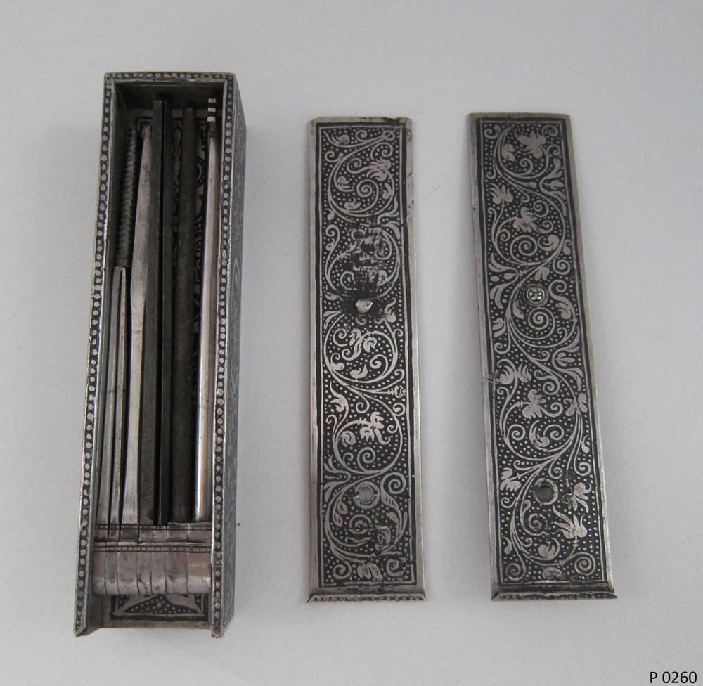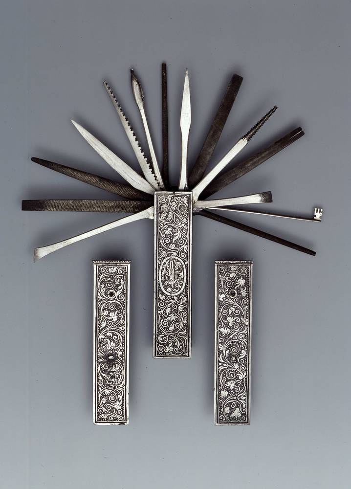 The iron box, decorated with the figures of Fortuna and Lucretia, features sliding lids and an intermediate shelf and contains fourteen small tools. On one side are three rasps, a pincer, a jigsaw, a knife, and a parting tool; on the other side are a wrench, four files, a square-pointed drill bit, and a pilot drill. This universal tool is a precursor to the modern pocketknife. In the inventory of the Kunstkammer (Cabinet of Curiosities) from 1595, this instrument is listed in connection with an “iron piercer or underleaf tool” made by Balthasar Hacker for Elector Christian I, and thus belonged to the category of “breaking tools.” These are devices used for breaking in or out.