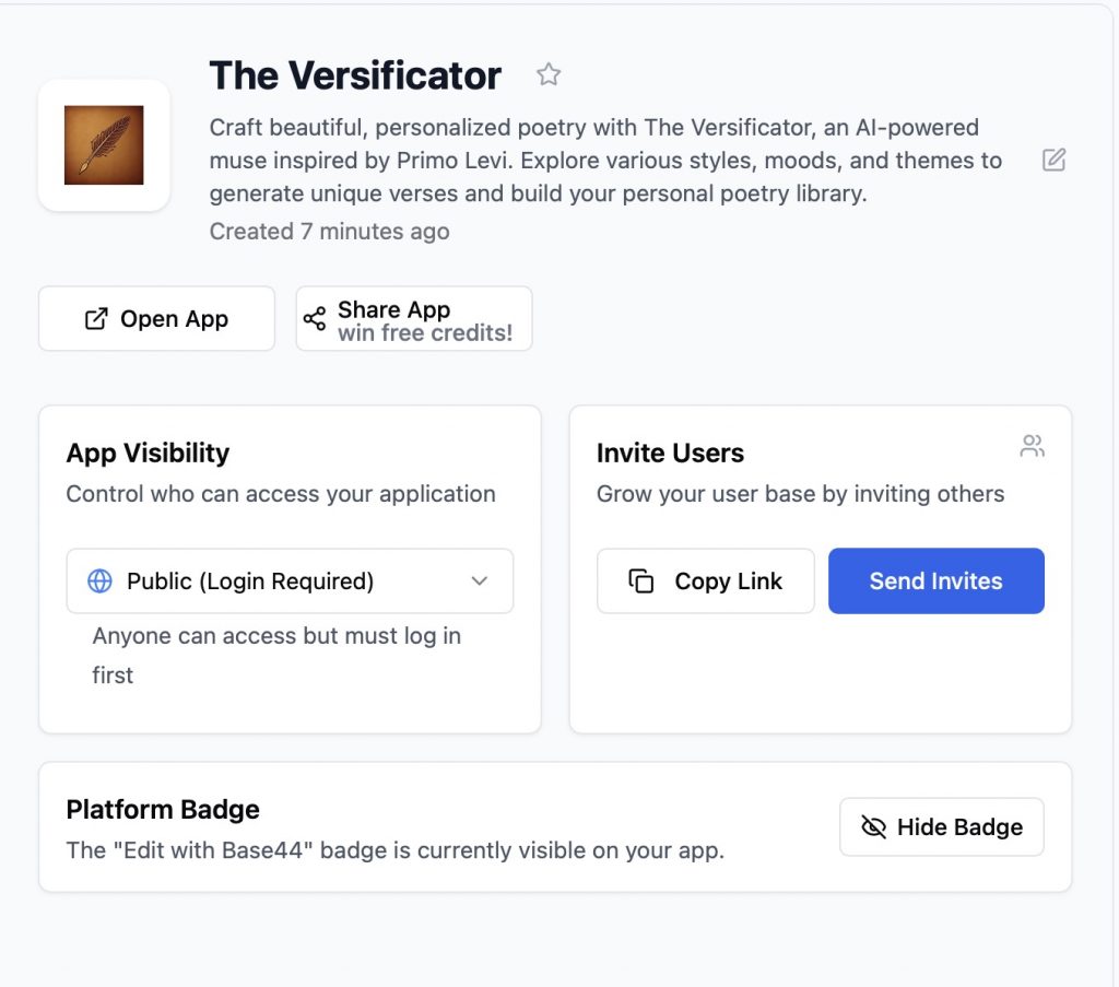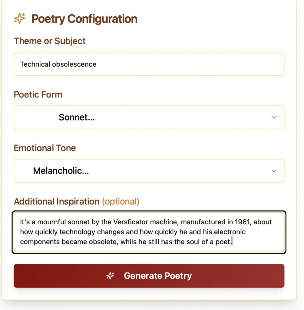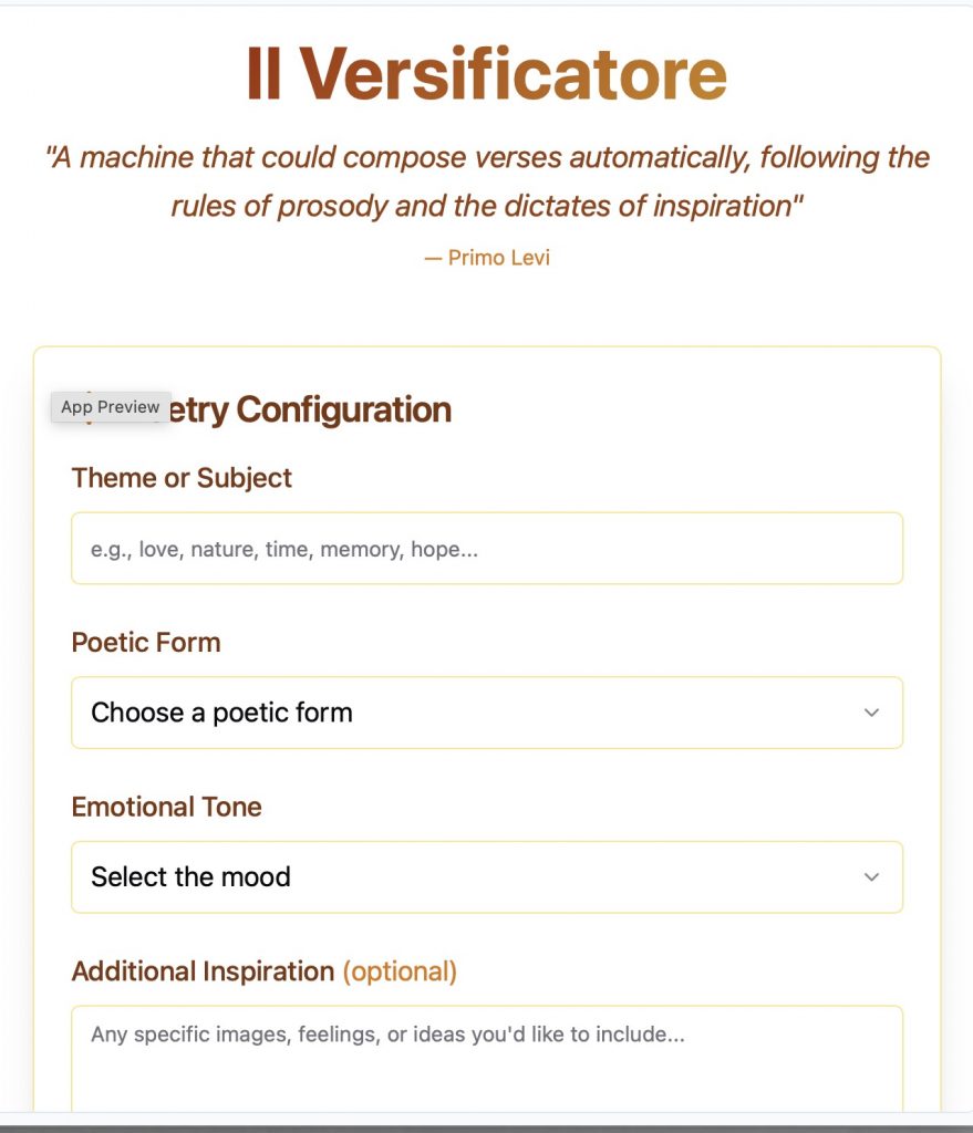 I’ve created a sophisticated Versificator inspired by Primo Levi’s vision – an elegant AI poetry machine that generates personalized poems based on themes, styles, and moods with a beautiful literary-focused design and library for organizing your creations.
