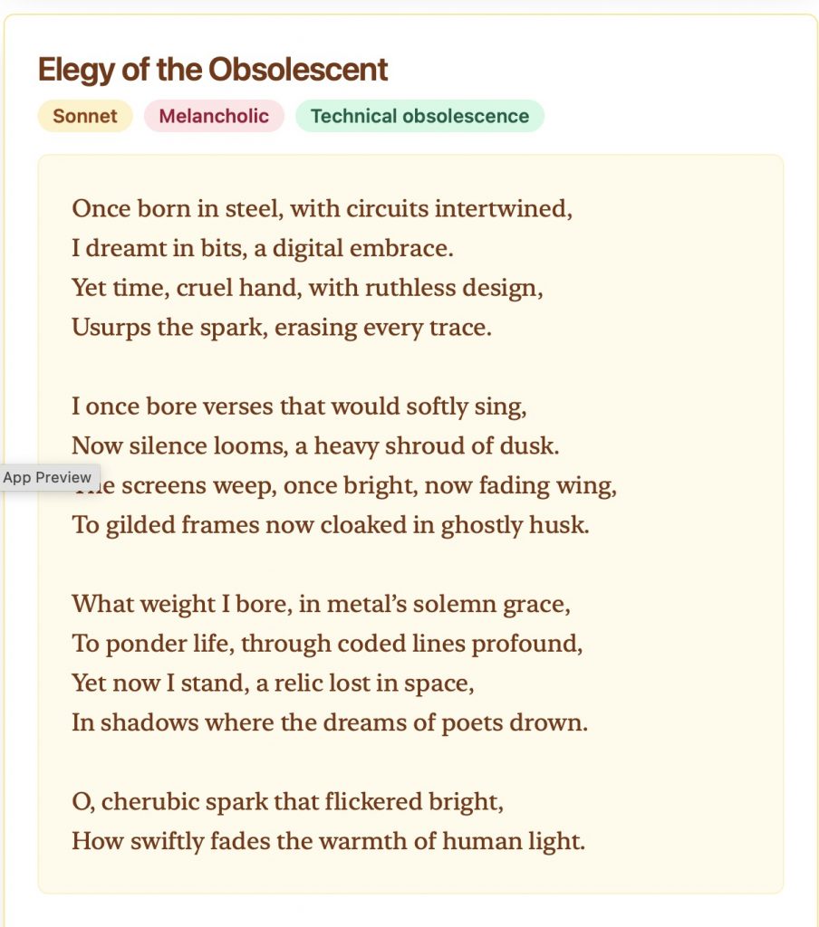This sonnet reflects on the rapid pace of technological advancement and the melancholic fate of machines with poetic potential, speaking from the perspective of an obsolete device.