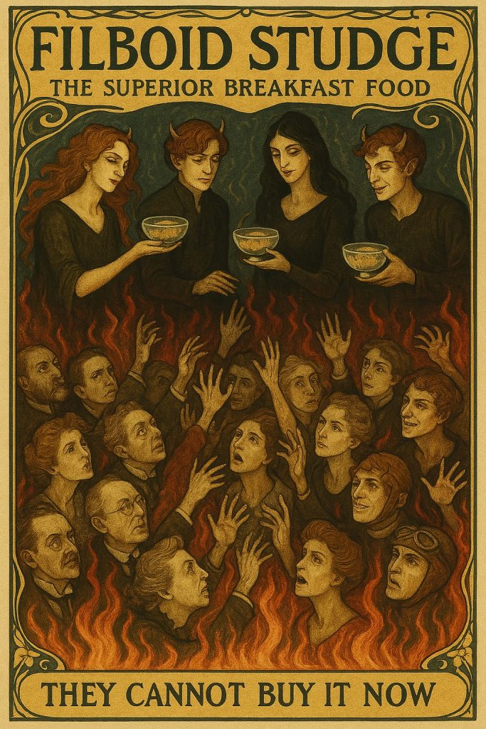 Please create an Edwardian, Art Nouveau promotional poster for a British breakfast food named “Filboid Studge.” This sombre poster depicts the Damned in Hell suffering torment from their inability to get at the Filboid Studge, which elegant young fiends hold in transparent bowls just beyond their reach. The scene on the poster is rendered even more gruesome by a subtle suggestion of the features of leading men and women of the Edwardian era in the portrayal of the Lost Souls; prominent individuals of both political parties, Society hostesses, well-known dramatic authors and novelists, and distinguished aeroplanists should be dimly recognizable in the doomed throng. At the bottom of this Filboid Studge poster is the warning, “They Cannot Buy It Now.”