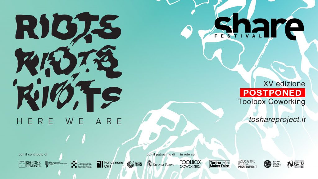 La XV edizione di Share Festival, la mostra italiana d’arte contemporanea legata all’evoluzione tecnologica e alla scienza, con la Direzione Artistica di Bruce Sterling, per il contenimento e gestione dell’emergenza epidemiologica Covid-19 e in accordo con il Dpcm 23 febbraio 2020, sarà posticipato a date da definire.